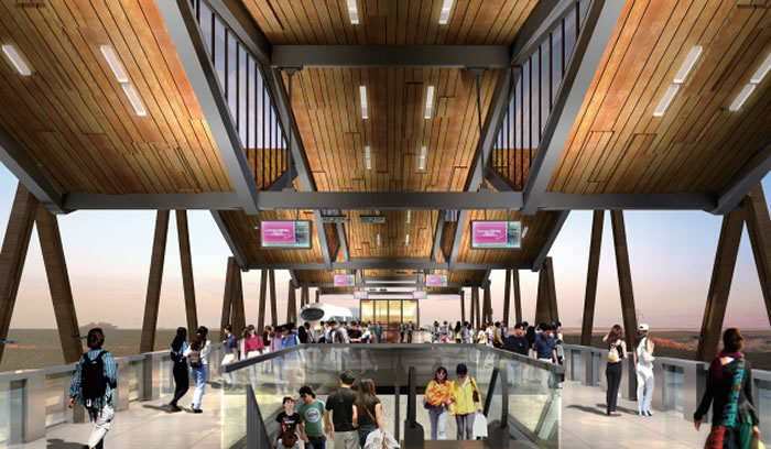 “山水重慶”是10號線的概念性主題,設計從基本功能空間出發,將站廳層、站臺層、屋面對應重慶山水格局中的江岸、人居空間、山巒地貌,從而映照“山水重慶”抽象概念。同時,設計傳承傳統巴渝建筑中的支撐結構,結合現代建筑手法,使用木材、剛才、竹膠合板等綠色建筑材料,讓“山水重慶”的空間概念在高架車站中立體呈現。
