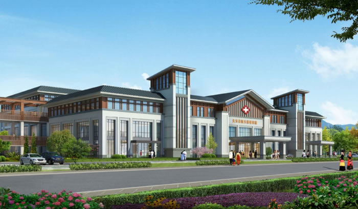 大方縣為彝族聚居地,多采用”土掌房“,由于山地地形有限,沿山而建時為了充分利用屋頂空間,采用了平屋頂形式作為曬場及室外空間。慈善醫院造型設計中刻意弱化了綜合醫院的大體量,突出了多個院落形成安定感,同時強調了平直線條的延伸感,與坡屋頂形成層次分明的造型感受。