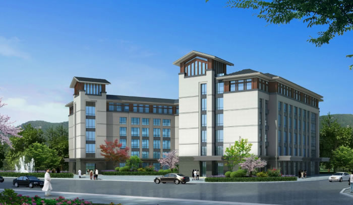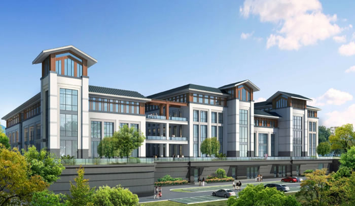 用現代的做法和材料來表現,立面主要采用石材與真石漆,色彩上以深淺搭配為主,。灰色寓意根植于厚重的山脈之中,大面積的白色增加反射光線的明度,緩解就醫人員的壓抑感。位于頂層的搭梁棕褐色真石漆象征山中的林木,為整體正大嚴肅的建筑風格增加了活力。