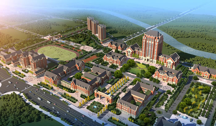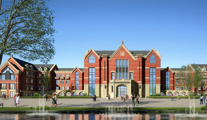 項目特色及難點:以西方古典宮殿及廣場的空間布局形制為規劃原則,形成功能性和視覺感并重的學院公共空間主軸,營造“禮儀書院”的氣質;著力打造水元素,結合英式建筑的圍合布置方式,實現“花園學府“構想。