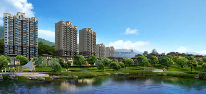 總體布局上以順應(yīng)山勢為首要原則,盡可能讓更多的戶數(shù)朝向景觀良好面。整個地塊山勢呈環(huán)抱狀,建筑布局遵循高處高建,低處低建的原則 ,由中心肖家溝水庫向北面,東面,南面布局依次為別墅,洋房,小高層,高層。結(jié)合地形高差減少各種類型的建筑之間相互遮擋,得到更多的湖景資源。別墅分布于御景半島,洋房分布:御景半島,高層分布:翡翠華庭,山水城,御景半島。