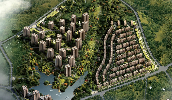 西地塊高層以小戶型低總價為特點,東側沿城市公園布置面積較大的一梯兩戶電梯洋房,內部布置面積略小的一梯兩戶電梯洋房,高層則以線、面的組合布置在項目的北地塊,使整個小區形成一個面向毗鄰公園的半圍合的空間,合而不圍,景觀共享,視野開闊。各類住宅基本為南北向布置,利用起伏的地形高差形成豐富的天際線。在單體布局時照顧高層建筑的朝向、采光、通風,錯位布置,避免噪聲和視線干擾。