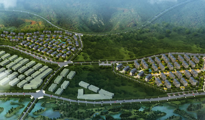 總平面布局規(guī)劃中以“兩山”“ 一帶”“ 八區(qū)”為主導(dǎo)構(gòu)架:水體濕地景觀帶貫穿用地成為項(xiàng)目的主要景觀軸線;一帶景觀水系連接各地塊,形成項(xiàng)目的副軸;兩山環(huán)抱用地,為社區(qū)提供豐富的自然景觀資源,道路綠化帶將整個(gè)社區(qū)分為8個(gè)組團(tuán)。