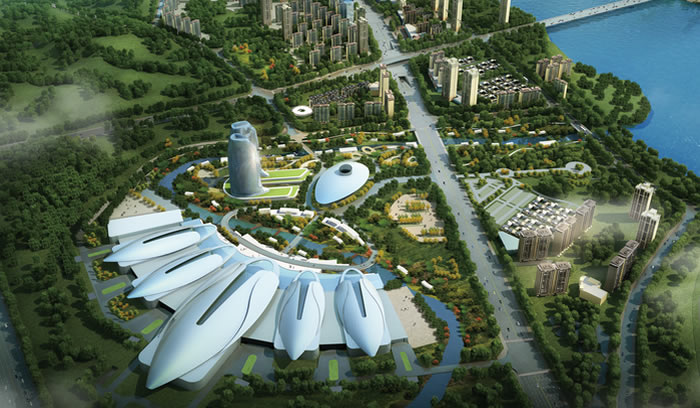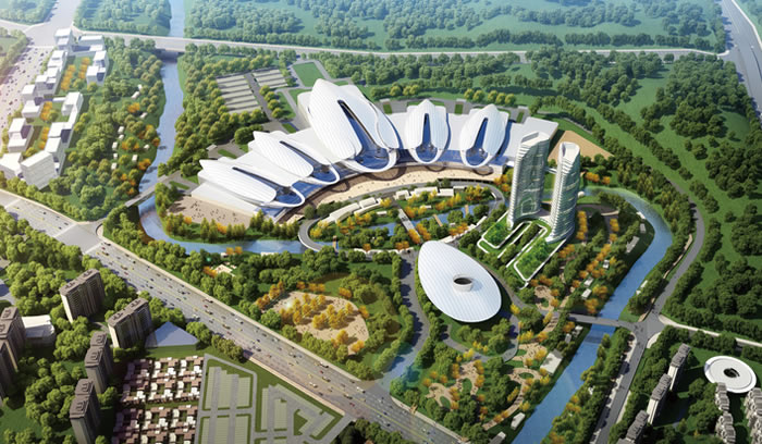 會(huì)展核心區(qū)分三棟單體建筑組成,分別為會(huì)展中心,會(huì)議中心,辦公酒店商業(yè)綜合體; 其中會(huì)展中心分為地面會(huì)展層,地下停車層,夾層辦公管理層,以及親水商業(yè)區(qū)。會(huì)展中心主體部分由5個(gè)大 型會(huì)展中心,一個(gè)大型綜合前廳組成,其中最大的展廳為100Mx200M,采用桁架結(jié)構(gòu)體系,最大跨度為50M,建 筑高度為35M,可根據(jù)各種需求靈活布展;其他展廳為60Mx120M,最大跨度為30M,建筑高度為25M。會(huì)展中心 屋面為銀白色金屬屋面,前廳玻璃幕墻為桁架體系玻璃幕墻系統(tǒng),玻璃分塊尺寸接近4Mx2M。 會(huì)議中由公共大廳,一個(gè)2000M2左右的大型報(bào)告廳,一個(gè)700M2左右的重型會(huì)議廳及若干中小型會(huì)議室組 成;會(huì)議中心采用鋼結(jié)構(gòu)桁架體系,底層架空,建筑高度為25M;由金屬板及玻璃幕墻包覆。