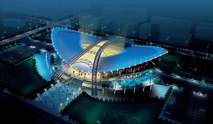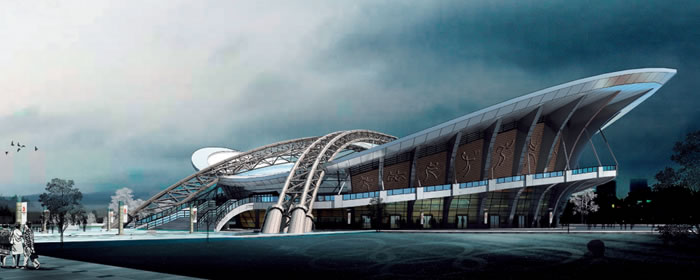 “動(dòng)感,莊嚴(yán)”是體育場(chǎng)的立意。建筑在立面上取意為蓄勢(shì)待發(fā)的雛鷹正做好準(zhǔn)備飛向浩瀚的天空,寓意雙橋工業(yè)園區(qū)的輝煌。中間的X形鋼架充滿力量感,欲向世人證明自己所具有的魄力。在立面造型上采用了簡(jiǎn)潔、明快的現(xiàn)代主義手法。