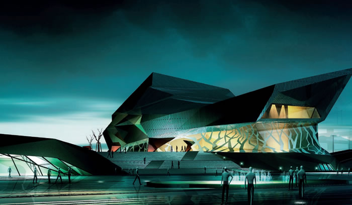 “石魚出水”與“魚躍龍門”在中國傳統文化中,魚是一種吉祥的象征。而“白鶴梁文化”中“石魚出水兆豐年”的題刻和石魚的特征,則形成了大眾對該區域認知的共同文化背景。本方案依托大眾這一共同文化背景,將大劇院設計成“石魚”的形象,使其成為城市的地標性建筑。